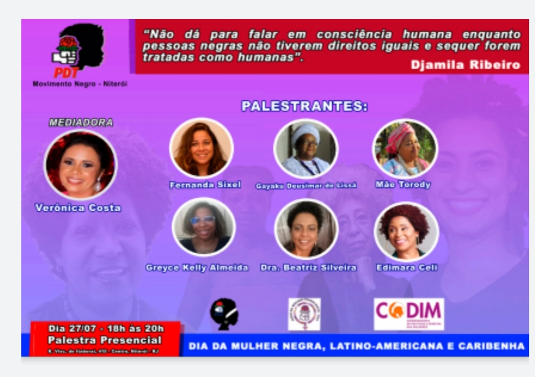Assim sendo, o Movimento Negro de Niterói te convida para palestra no dia 27/07/21, das 18h às 20h, na Rua Visconde de Itaboraí, 415, Centro, Niterói, RJ, onde temas importantes estarão sendo abordados.