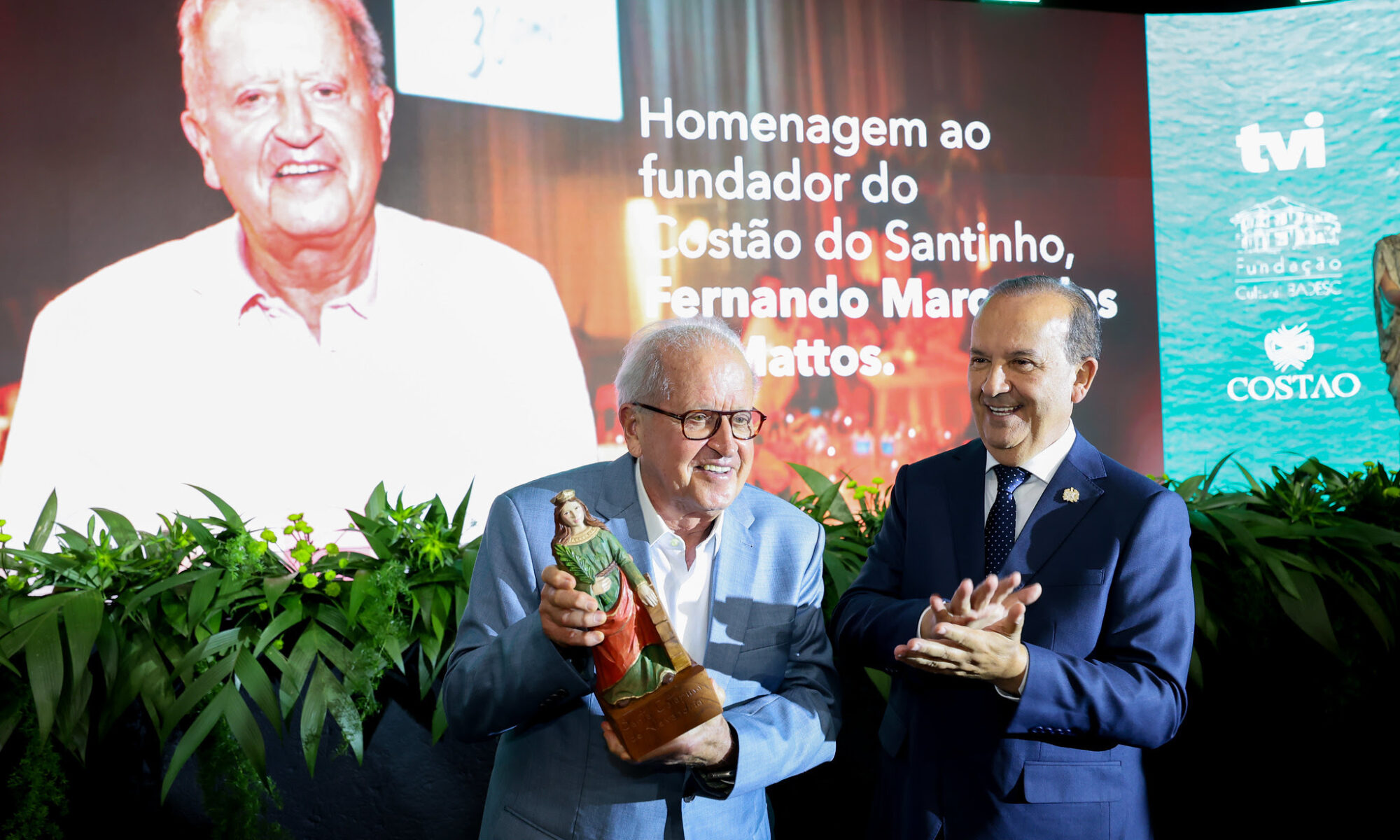 Fundador do Costao do Santinho Resort, empreendimento que se consolidou como um dos principais ícones do turismo nacional, Fernando Marcondes foi homenageado com a entrega de uma imagem de Santa Catarina, símbolo do reconhecimento ao legado de quem ajudou a posicionar o Estado como referência em hospitalidade, sustentabilidade e excelência em serviços. O momento foi marcado por aplausos de pé de todos os presentes.