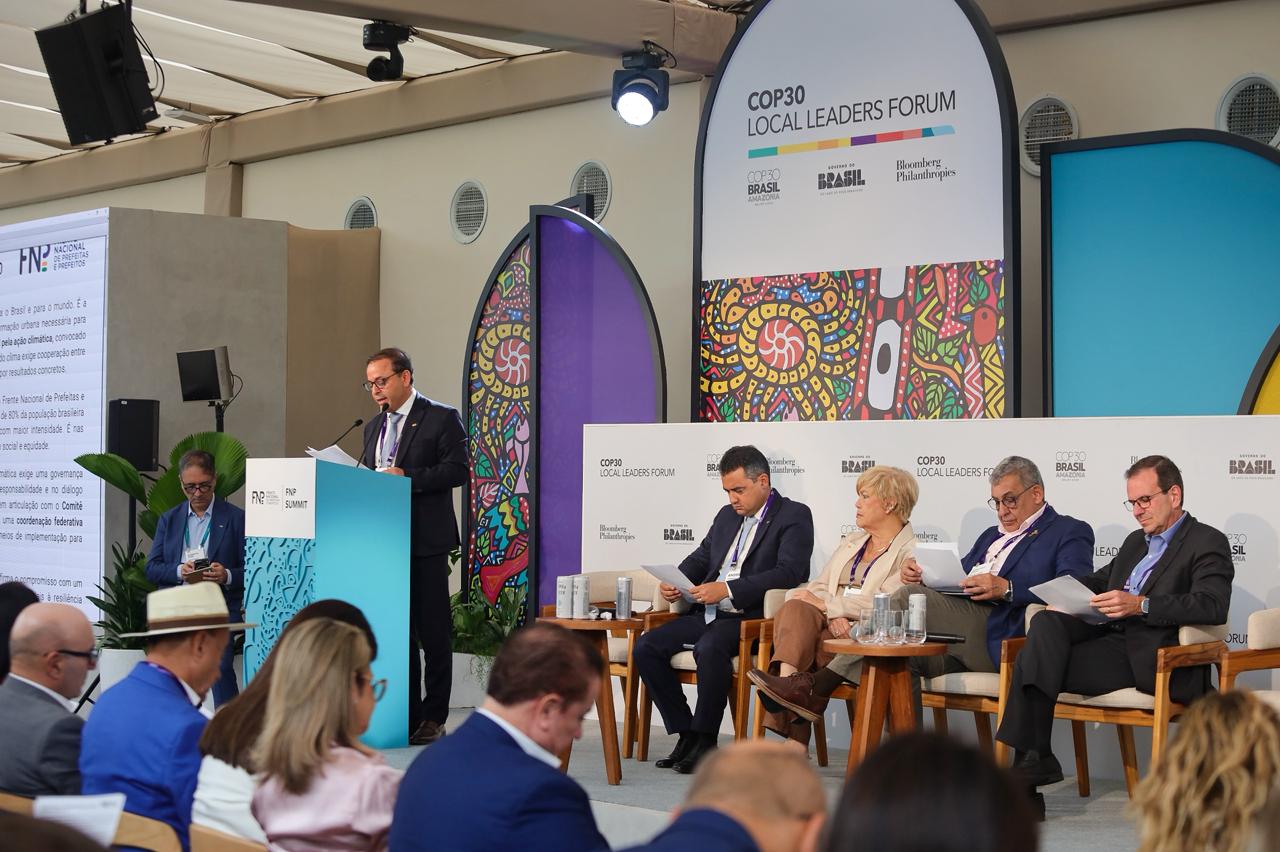 O prefeito de Niterói e vice-presidente de Relações Internacionais da Frente Nacional de Prefeitos (FNP), Rodrigo Neves, participou dos debates da 88ª Reunião Geral da FNP, que acontece de forma integrada à Cúpula Mundial de Prefeitos, no Museu de Arte Moderna, no Rio de Janeiro. O prefeito fez a leitura da Carta Compromisso que reúne as posições dos gestores municipais para a COP 30, que começa no próximo dia 10, em Belém, no Pará.