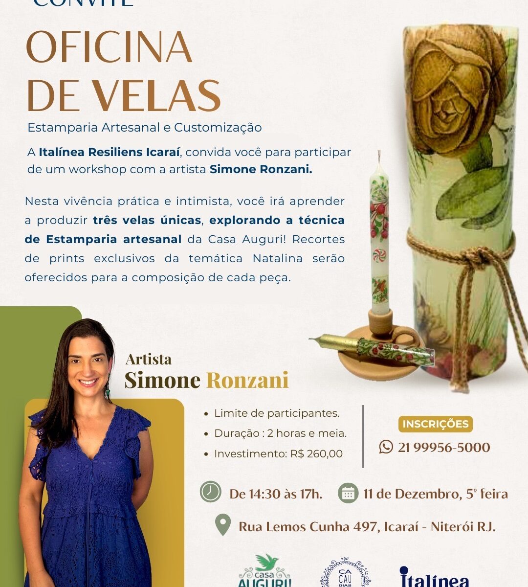 Você é nosso convidado para participar de uma oficina de velas-estamparia artesanal e customização com a artista Simone Ronzani.
