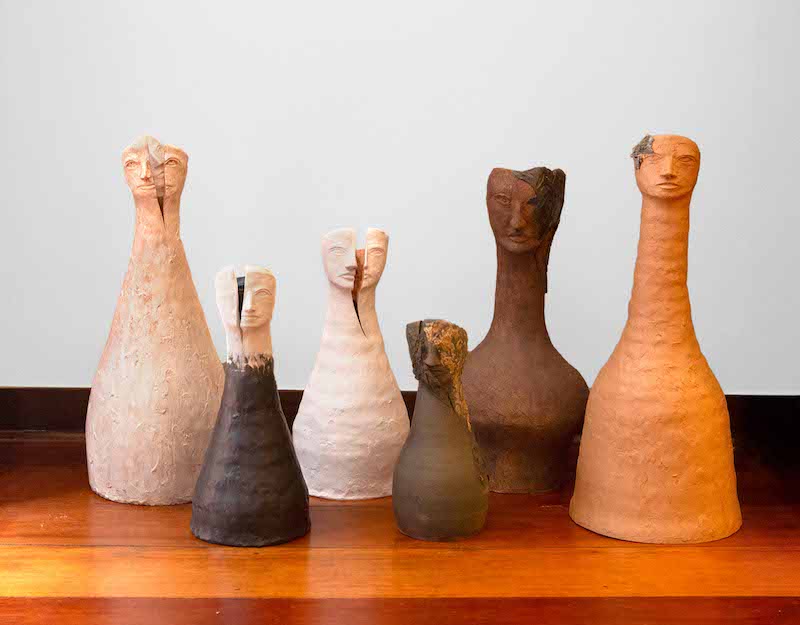 Habitantes do imaginário de Raquel, seus seres — sem gênero definido — moldados em argila ou barro, podem atingir dois metros de altura.