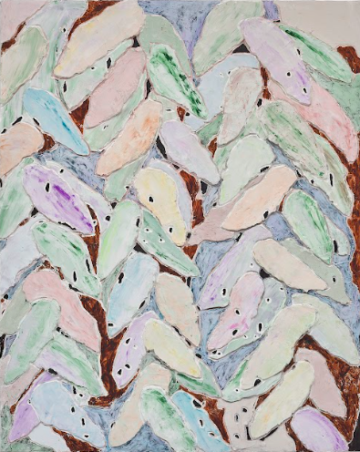 “As obras são marcadas por imperfeições, desgastes e descontinuidades”, diz. Do gesto brutal e eminentemente físico/corpóreo emergem formas sensíveis e delicadas que lembram elementos naturais como plantas, folhas, com cores mais pronunciadas, outras já trazem o caráter mais abstrato da matéria desbotada e rachada.