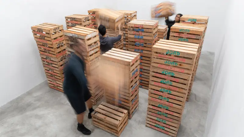 Nas ripas das caixas surgem pares de nomes pintados em cores vibrantes — José/Macaxeira, João/Maniva, Silva/Aipim, Santos/Mandioca — aproximando duas linhagens fundamentais da cultura brasileira: de um lado, nomes e sobrenomes amplamente difundidos na população; de outro, os diferentes nomes da Manihot esculenta, raiz ancestral cultivada há milênios e base alimentar em várias regiões do país. Ao cruzar nomes humanos e nomes vegetais, a obra conecta alimento, linguagem e identidade cultural, revelando a diversidade de histórias e tradições que atravessam a formação brasileira.