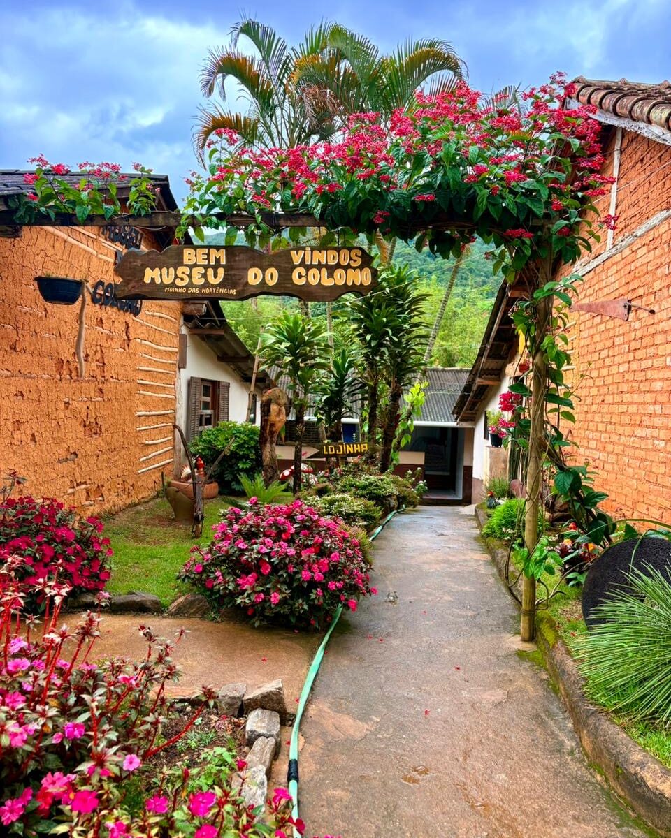 A área externa do Museu do Colono complementa a experiência com jardins, caminhos para caminhada, cenários para registros fotográficos e um lago que abriga carpas recém-chegadas, criando um ambiente agradável para contemplação e lazer.